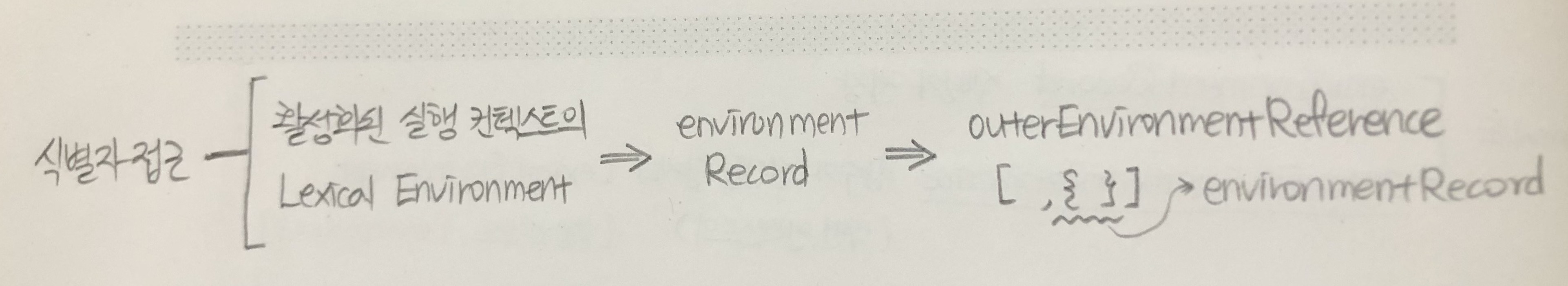 식별자에 접근하려고 하면 현재 실행 컨텍스트이 L.E에서 식별자를 저장해놓은 environmentRecord에서 찾고, 만약에 없으면 outerEnvironmentReference에 가서 직전 컨텍스트의 environmentRecord에서 찾아본다. 없으면 또 outerEnvironmentReference에서 직전 컨텍스트의 environmentRecord를 계속 반복하면 전역 컨텍스트의 L.E로 가서 전역 변수를 참조할 수 있게 되고, 이렇게 점점 상위 컨텍스트로 가면서 식별자를 찾는 스코프 체인이 발생한다.