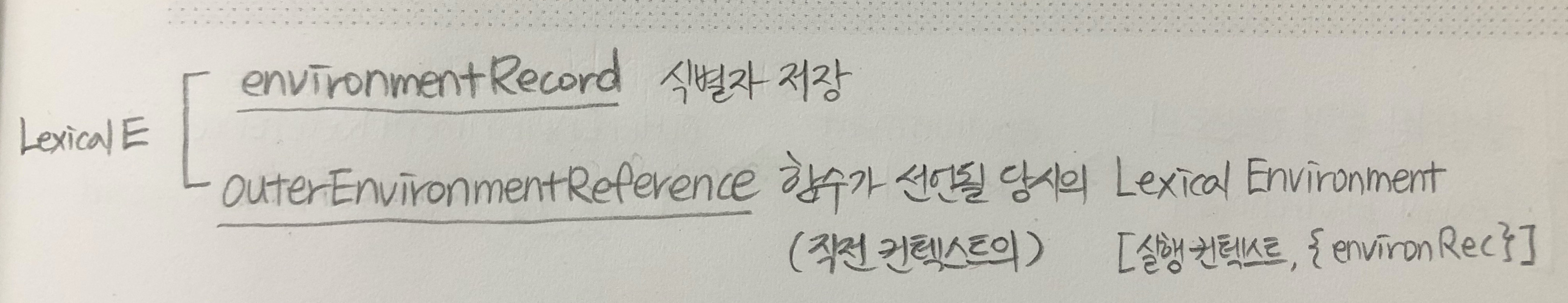 | Lexical Environment | 식별자 정보, 외부 환경 정보를 실시간 반영, V,E를 그대로 복사해서 활용 | |