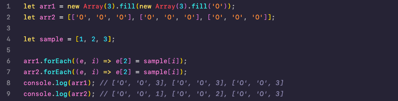 안쪽의 fill 메서드 안에는 문자열인 정적인 값을 넣었지만, 바깥의 fill 메서드 안에 배열(['O', 'O', 'O'])을 넣었다. 그렇기 때문에 forEach로 내부 배열의 값을 하나씩 변경할 때 모든 원소들이 같이 값이 바뀌었던 것이다.(같은 주소값)