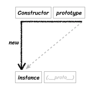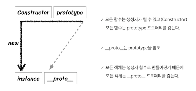 new 연산자로 Constructor를 호출하면 instance가 만들어지는데, 이 instance의 생략 가능한 프로퍼티인 __proto__는 Constructor의 prototype을 참조한다!