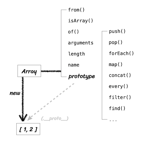 Array를 new 연산자와 함께 호출해서 인스턴스를 생성하든, 그냥 배열 리터럴을 생성하든, instance인 [1, 2]가 만들어진다. 이 인스턴스의 __proto__는 Array.prototype을 참조하는데, __proto__가 생략 가능하도록 설계돼 있기 때문에 인스턴스가 push, pop 등의 메서드를 마치 자신의 것처럼 호출할 수 있다.