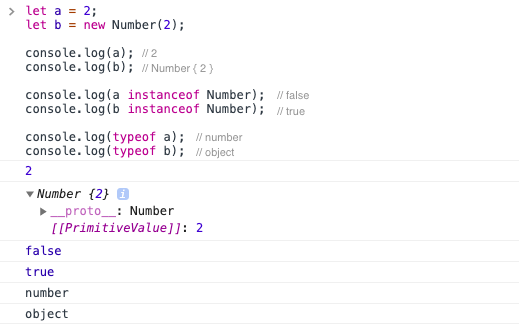 a는 리터럴로 생성했기 때문에 instance가 아니고, 그렇기 때문에 a instanceof Number는 false다. 그리고 인스턴스 객체가 아니기 때문에 당연히 __proto__속성을 갖지 않는다. typeof로 비교해보았을 때도 리터럴로 생성한 a는 number가 나오지만, Number 생성자로 만든 b는 인스턴스 객체이기 때문에 object가 나온다.