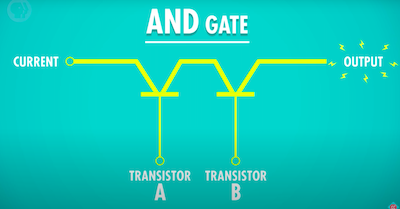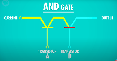 AND 게이트를 만들기 위해서 두 개의 트랜지스터를 직렬로 연결한다. 두 input 모두 ON일 때만 output에 전류가 흐를 수 있다. 표로 작성해보면 아래와 같다.