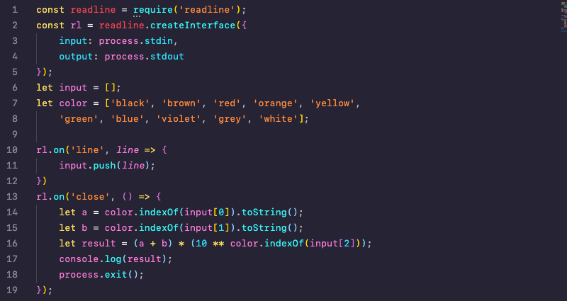 각각의 색에 대한 값, 곱을 처음에는 객체로 정리하려다가 인덱스 값이 곧 값이어서 배열로 했다. 입력값의 첫 번째, 두 번째의 '값'을 문자열로 더해서 숫자를 이어서 연결해주고, 세 번째 입력값의 '곱'은 10의 '인덱스'승한 값과 같기 때문에 곱해주었다.