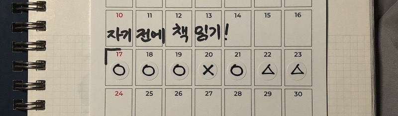 저번 주에 다짐했던 것이 컨디션 조절, 자기 전 책 읽기, 블로그 정리, 주말에 열심히 공부하기..이 중 만족하는 건 자기 전 책 읽기.