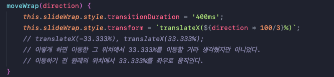 translate에 값의 단위로 %를 쓸 때 해당 요소의 너비 높이 기준이라고 대단한 착각을 했었다. 그래서 3개의 슬라이드를 캐로셀로 만들 때 방향버튼을 누를 때마다 33.333%로 이동하고 반대 방향일 때는 -33.333%로 이동해야겠다라고 생각했다. 그래서 다음과 같은 코드를 짰었다.