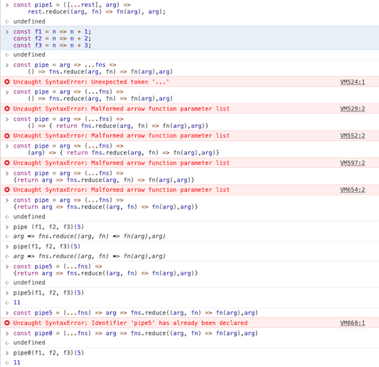 화살표함수에는 elements 객체가 없어서 어떻게 인자들을 받아와야할까 했는데 디코에게 rest parameter 힌트를 얻었다. 그래서 여기에 커링을 한 스푼 더해 화살표함수로 pipe함수를 만들 수 있었다.