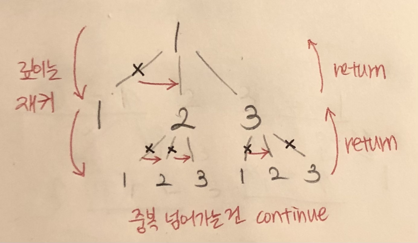 ✱ 깊이로 들어가는 건 재귀, 중복 넘어가는 건 continue, 마지막 깊이에서 빠져나오는 건 return